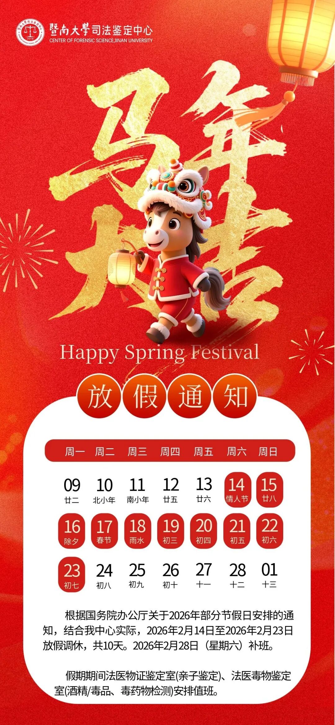 根据国务院办公厅关于2026年部分节假日安排的通知,结合我中心实际,2026年2月14日至2026年2月23日放假调休,共10天。2026年2月28日(星期六)补班。